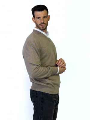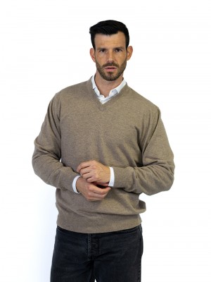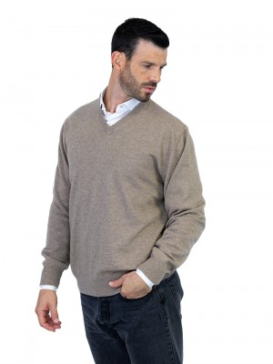 Long-sleeved V-neck entirely made of cashmere. Classic garment with a regular fit.